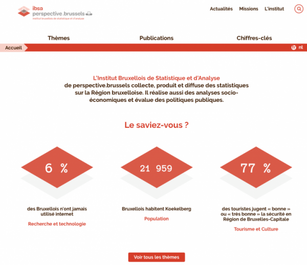 Vous y retrouverez les rubriques habituelles telles que les publications, les actualités, les thèmes... Mais également du contenu supplémentaire et des nouvelles fonctionnalités comme des graphiques dynamiques, des pages plus détaillées sur les missions de l’IBSA ou encore une infographie reprenant les chiffres-clés de la Région de Bruxelles-Capitale.