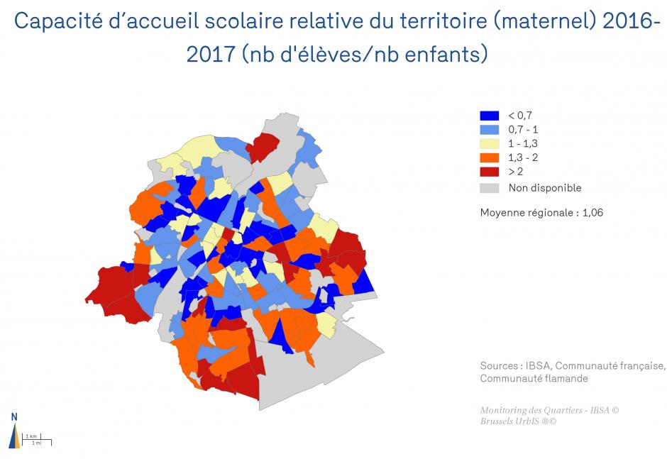 Par ailleurs, toutes les créations de places ne se sont pas réalisées dans les zones qui en avaient le plus besoin. Il reste donc encore des déséquilibres à combler.Le Monitoring des Quartiers de la Région de Bruxelles-Capitale fournit un indicateur « la capacité d’accueil scolaire relative du territoire » qui permet d’évaluer la capacité d’un quartier à répondre à la demande en scolarisation de ses habitants.
